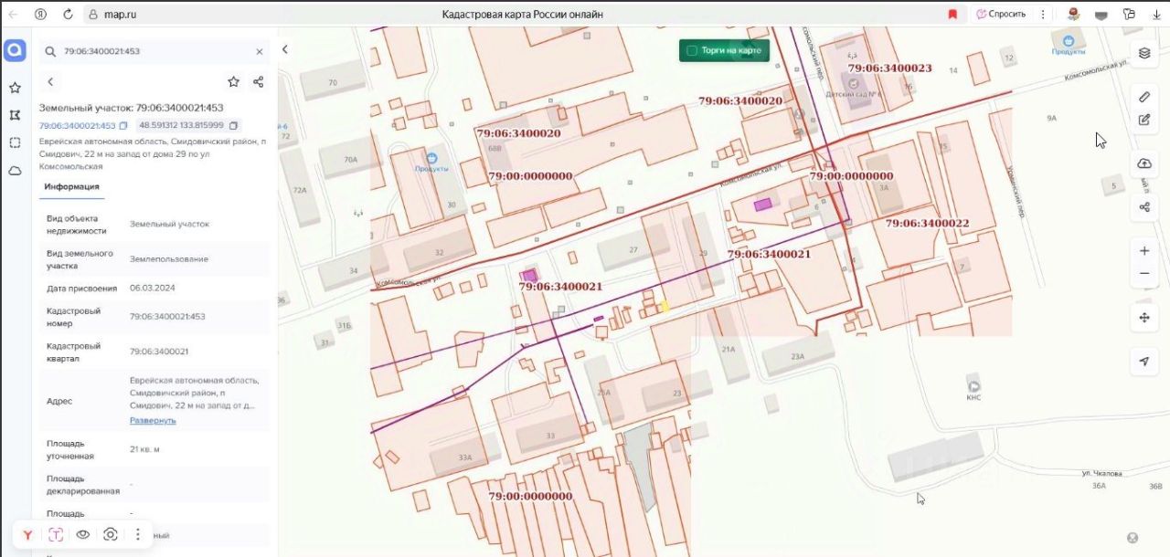 Земельный участок с кадастровым номером 79:06:3400021:453 площадь 21 по адресу Еврейская автономная область, Смидовичский район, п Смидович, 22 м на запад от дома 29 по ул Комсомольская