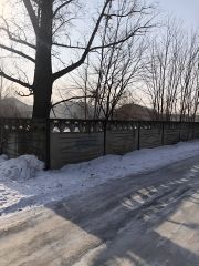 По периметру территория ограждена бетонным, глухим забором. Есть сторожка для сторожа. У ворот проходят ж/д пути, что важно для работы с грузами.