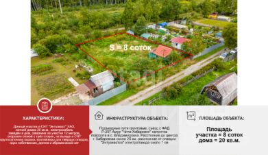 Предлагается к покупке дачный участок в СНТ "Энтузиаст" ЕАО, въезд в общество напротив поворота в п. Приамурский. Площадь участка 8 соток, межевание проведено, скважина на участке. Участок огорожен забором-сеткой с трёх сторон. Имеется небольшой летний домик площадью 20 кв.м. Проведено электричество в дом. Из насаждений: малина, виноград, калина, различные цветы. Участок в текущем году не обрабатывался. На въезде в СНТ круглосуточная охрана, в одном месте расположены контейнеры для твёрдых отходов. Подъездные пути грунтовые. Съезд с ФАД Р-297 Амур "Чита-Хабаровск" напротив поворота в с. Владимировка. Расстояние до центра г. Хабаровска около 25 км., до станции электропоезда "Энтузиастов" - около 1 км. Один собственник, долгов и обременений нет.
