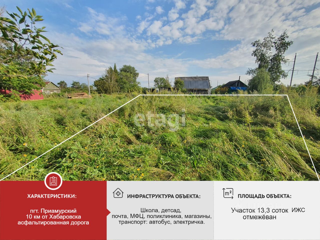 Продам земельный участок общей площадью 13,3 соток Участок расположен на левом берегу Амура в п. Приамурский. Участок в собственности, категория земли — для индивидуального жилищного строительства, сделано межевание. Вдоль участка — ЛЭП, поэтому проблем с подключением электроэнергии не возникнет. Участок отлично подойдет для строительства загородного дома. Тихий спокойный район поселка. Рядом лес, протока реки, рыбалка, грибы, отдых на природе. Звоните. Договоримся о времени просмотра.